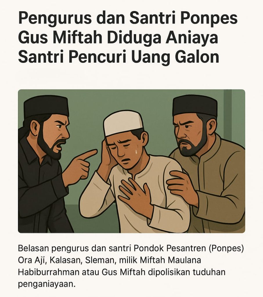 Sleman – Seorang santri asal Kalimantan melaporkan dugaan penganiayaan yang diduga dilakukan oleh belasan pengurus dan santri Pondok Pesantren (Ponpes) Ora Aji, Kalasan, Sleman. Insiden tersebut terjadi pada 15 Februari 2025 dan kini tengah bergulir di ranah hukum. Korban berinisial KDR (23), santri aktif di Ponpes yang diasuh oleh Miftah Maulana Habiburrahman alias Gus Miftah, […]